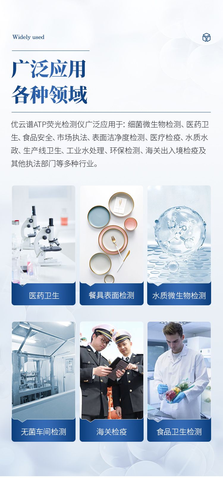 優云譜ATP熒光檢測儀廣泛應用于:細菌微生物檢測、醫藥衛生、食品安全、市場執法、表面潔凈度檢測、醫療防疫、水質水政、生產線衛生、工業水處理、環保檢測、海關出入境檢疫及其他執法部門等多種行業。