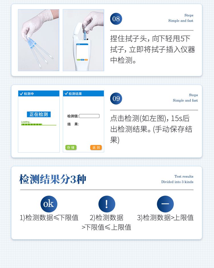 該設備為全新升級產品,安卓智能操作系統。操作采用生物化學反應方法檢測ATP含量,ATP熒光檢測儀基于螢火蟲發光原理,利用“熒光素酶—熒光素體系”快速檢測三磷酸腺苷(ATP)。ATP拭子含有可以裂解細胞膜的試劑,能將細胞內ATP釋放出來,與試劑中含有的特異性酶發生反應,產生光,再用熒光照度計檢測發光值,微生物的數量與發光值成正比,由于所有生物活細胞中含有恒量的ATP,所以ATP含量可以清晰地表明樣品中微生物與其他生物殘余的多少,用于判斷衛生狀況。