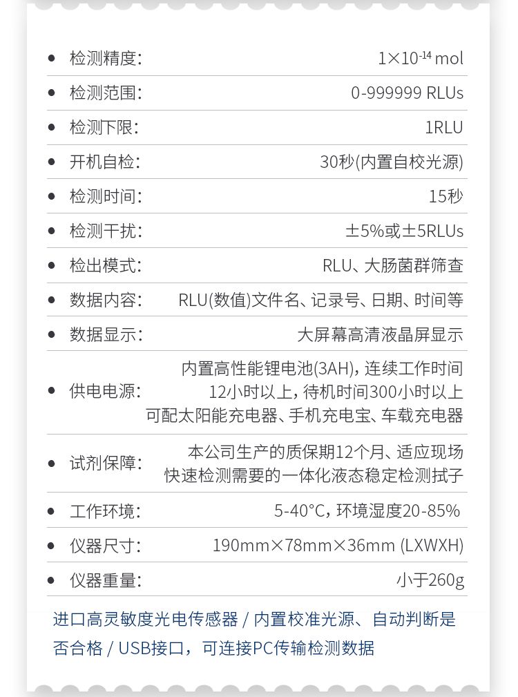 隨機配置:ATP熒光檢測儀(手持)主機、儀器包、掛繩、PC數據線、數據分析軟件、中文操作手冊