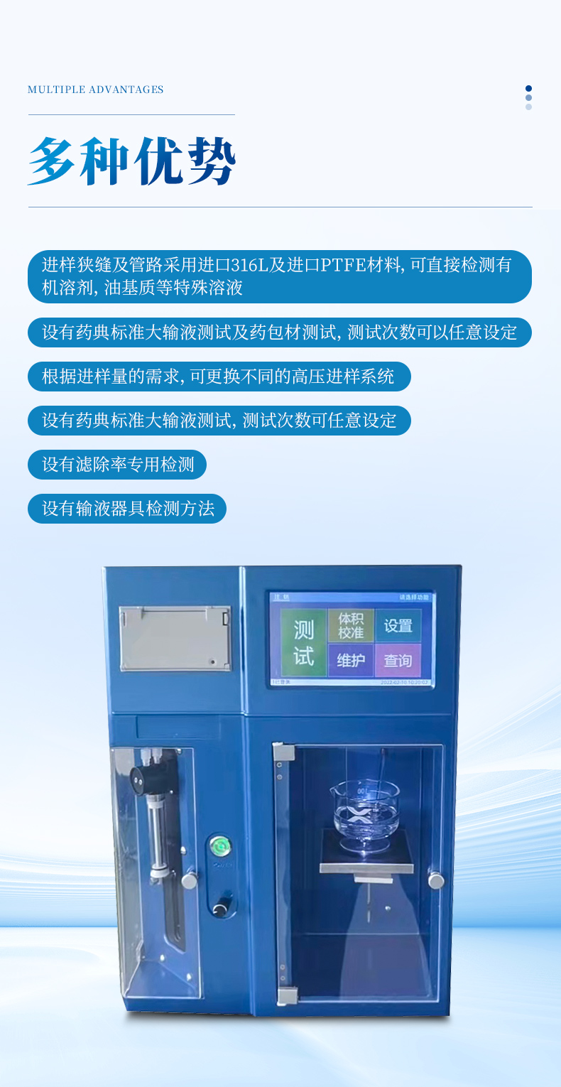 l滿足《中國藥典》可直接檢測注射液、無菌粉、麻醉包、輸液器具及一次性血路等產品的微粒含量及大小,符合GB8368-1998,、GB31935-2003、6B368-205及GB83568-2018的檢測標準