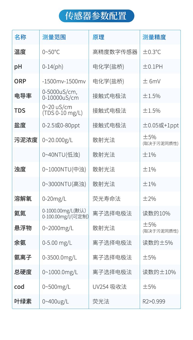 | 15 | cod | 0~500mg/ L | UV254 吸收法 | ±5% | COD與葉綠素帶有自動清潔器,可防止生物附著,避免光窗污染,以保證長期監測依然具有穩定性;可設置自動清潔時間及清潔次數,功耗0.7W | |