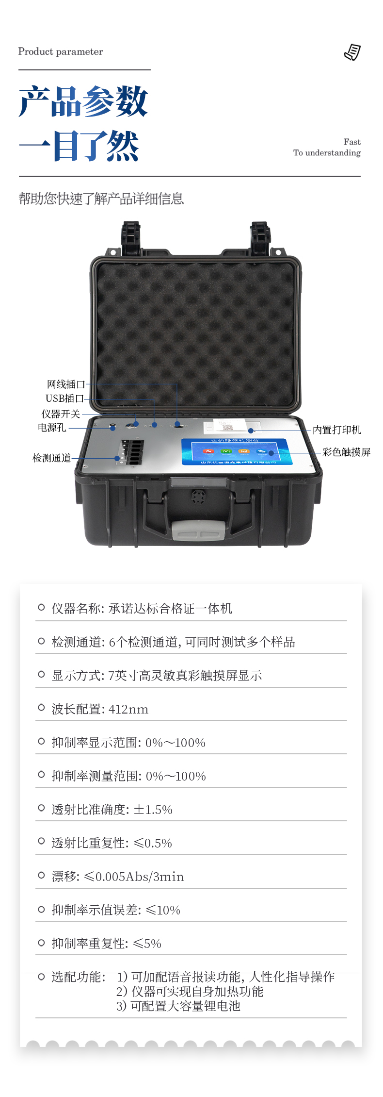 1、高強度PVC工程塑料手提箱設計,堅固耐用,便于攜帶,供電方式為交直流兩用,可野外流動測試配套成品藥劑。