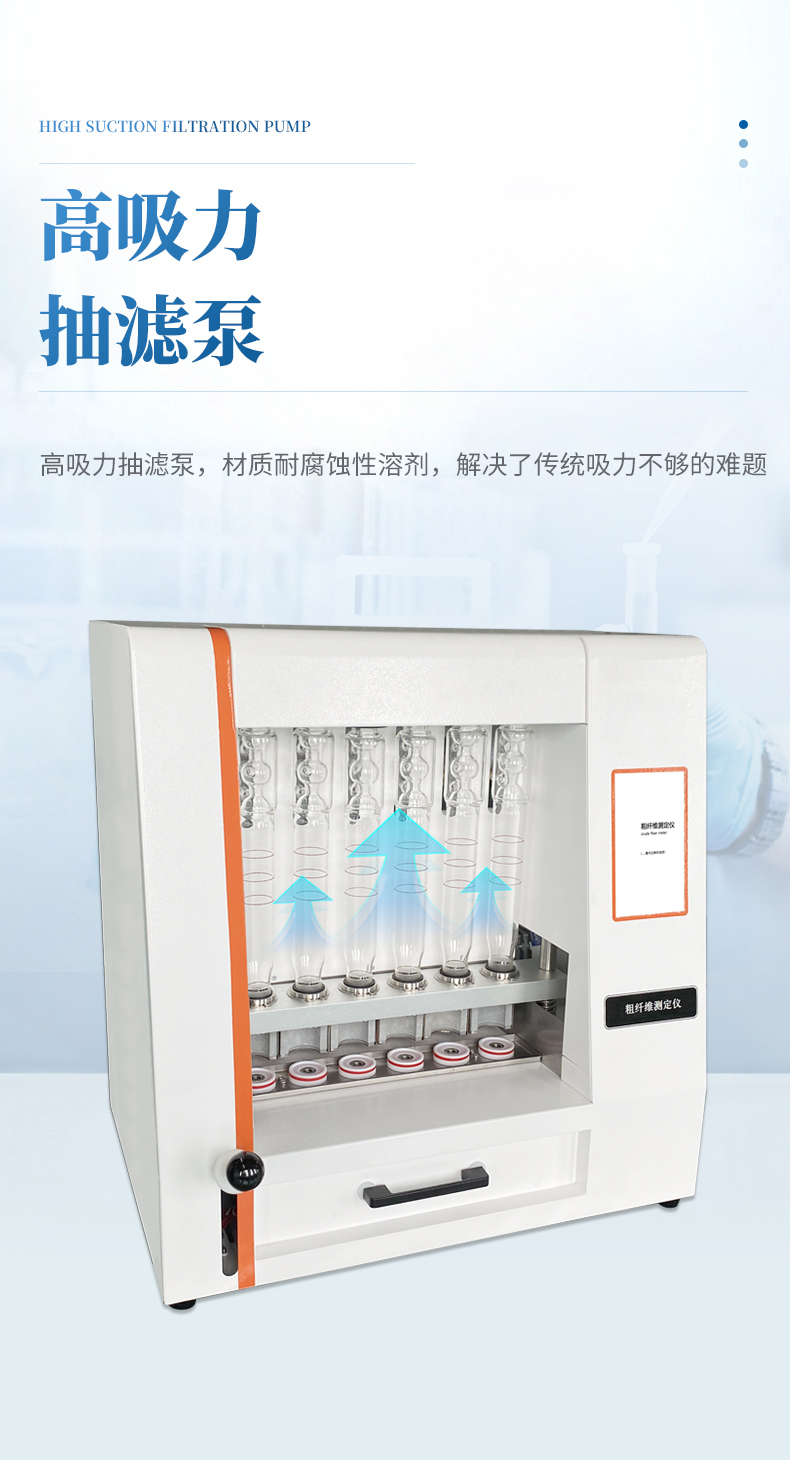 粗纖維測(cè)定儀是一款操作簡(jiǎn)單、應(yīng)用靈活的纖維含量檢測(cè)儀器,可用于 傳統(tǒng)的溫德法檢測(cè)粗纖維和范式法檢測(cè)洗滌纖維。它是以酸堿洗滌法原理,集酸、堿 處理及沖洗于一體,采用全封閉電加溫、加液、消煮、抽濾、沖洗的方法來(lái)測(cè)定纖維 含量。適用于植物、飼料、食品及其它農(nóng)副產(chǎn)品中粗纖維的測(cè)定以及洗滌纖維、纖維 素、半纖維素和其它相關(guān)參數(shù)測(cè)試,其結(jié)果符合GB/T5515、GB/T6434的規(guī)定。