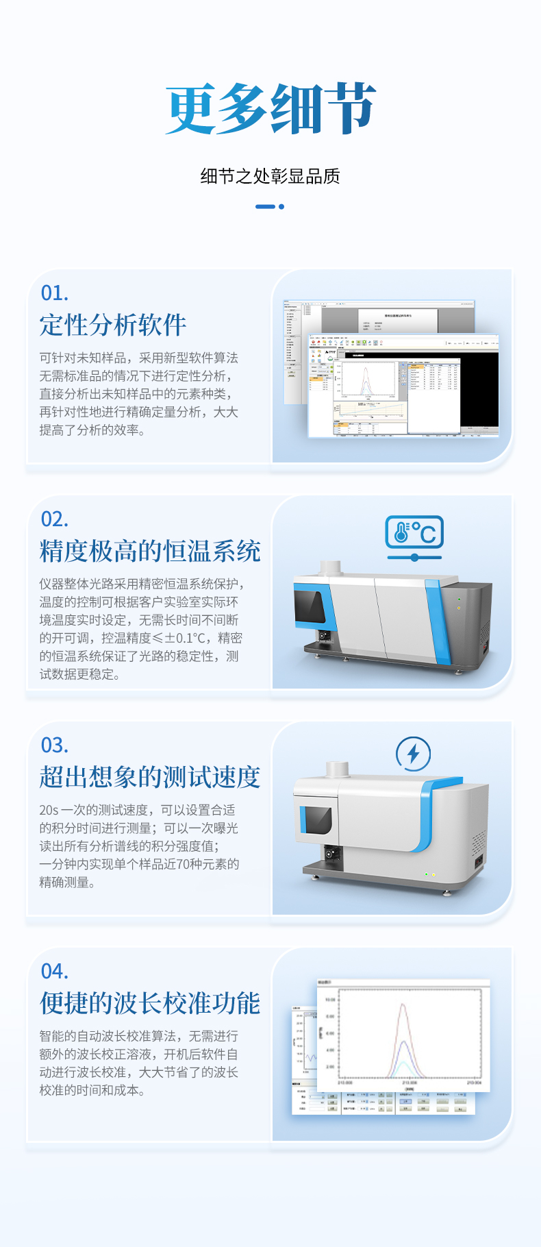 7、超高分辨率的光路系統: 儀器配置了超高分辨率的 4320 刻線的進口光柵,配合獨有的光路調節專利 技術,把普通儀器的分辨率約 0.008nm 降低至 0.005nm 以內,超高的分辨率保證 了測試元素之間沒有相互干擾。
