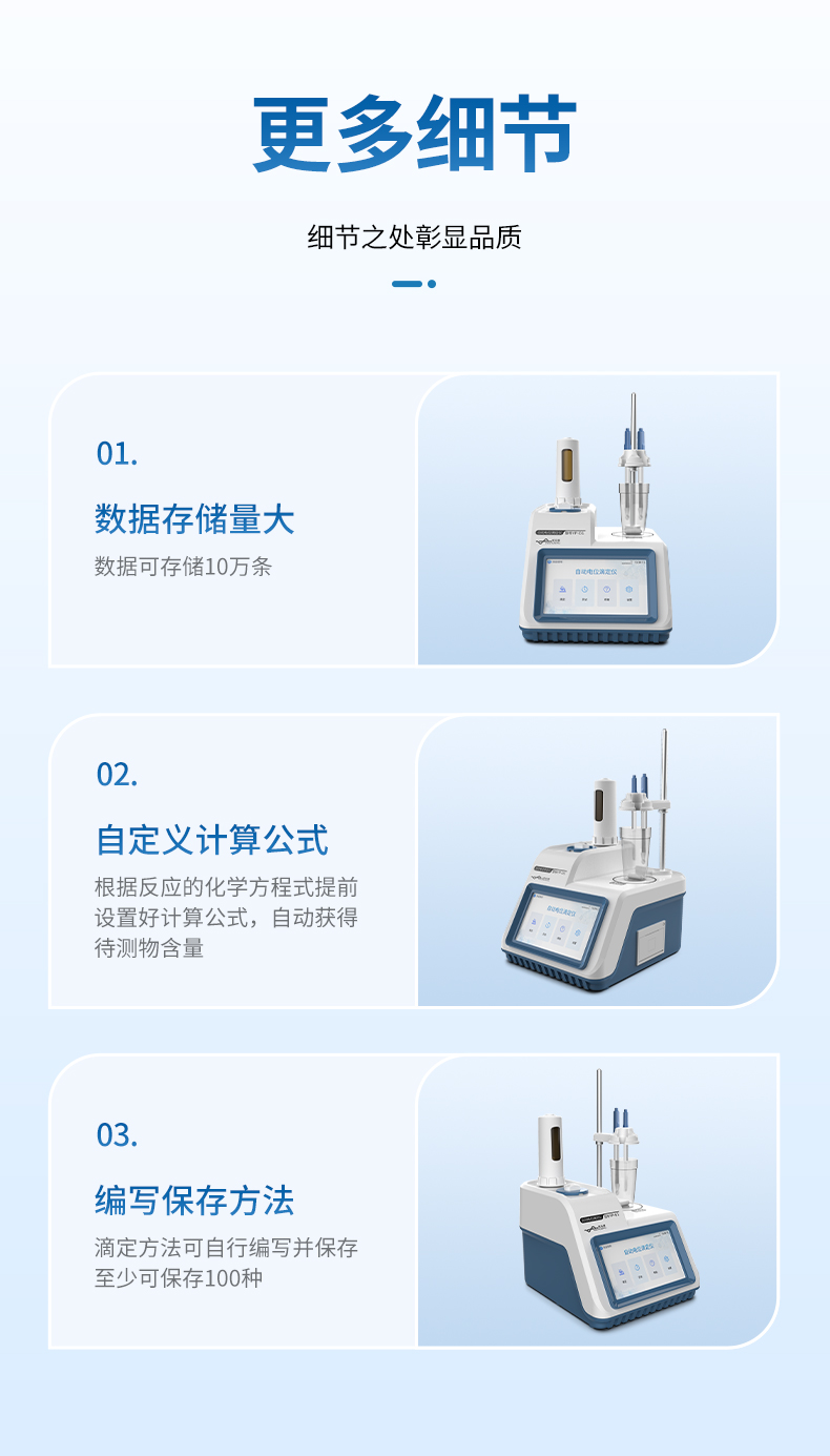 4、支持動態滴定、等量滴定、手動滴定的滴定方式,可預設滴定終點或自動識別終點滴定,方便用戶根據樣品特性選擇最佳滴定工作流程;