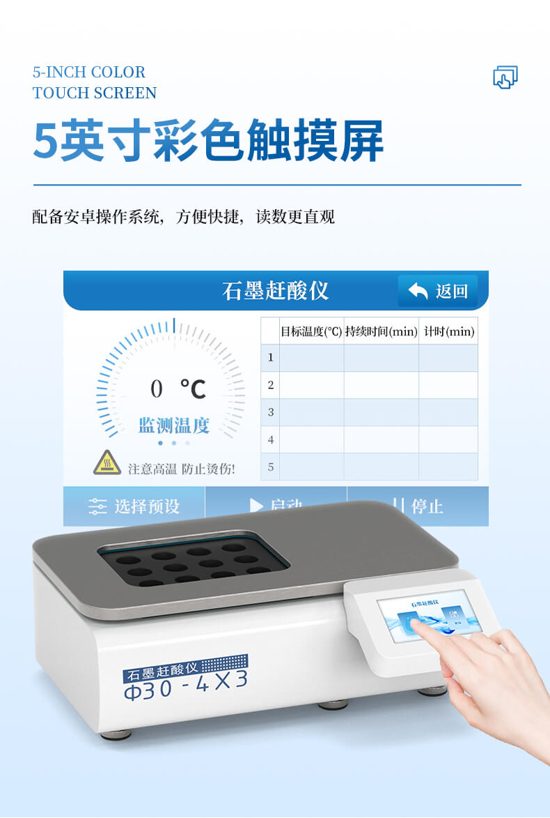 采用優質石墨爐內芯,平均溫差較小,樣品效果一致性好,熱傳導效率更高。石墨塊具有特氟龍涂層,耐腐蝕,延長使用壽命。