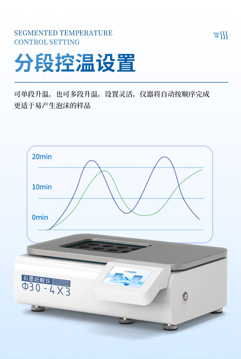 分段控溫設置,即可單段升溫,也可多段升溫,設置靈活,儀器將自動按順序完成。更適于易產生泡沫的樣品。