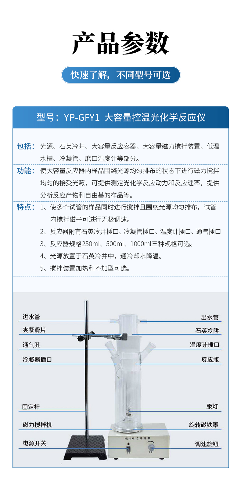 | 包括:光源、石英冷井、大容量反應(yīng)容器、大容量磁力攪拌裝置、低溫水槽、冷凝管、磨口溫度計等部分。 功能:使大容量反應(yīng)器內(nèi)樣品圍繞光源均勻排布的狀態(tài)下進(jìn)行磁力攪拌均勻的接受光照,可提供測定光化學(xué)反應(yīng)動力和反應(yīng)速率,提供分析反應(yīng)產(chǎn)物和自由基的樣品等。 特點:1、使多個試管的樣品同時進(jìn)行攪拌且圍繞光源均勻排布,試管內(nèi)攪拌磁子可進(jìn)行無極調(diào)速。 2、反應(yīng)器附有石英冷井插口、冷凝管插口、溫度計插口、通氣插口 3、反應(yīng)器規(guī)格250ml、500ml、1000ml三種規(guī)格可選。 4、光源放置于石英冷井中,通冷卻水降溫。 5、攪拌裝置加熱和不加型可選。 |