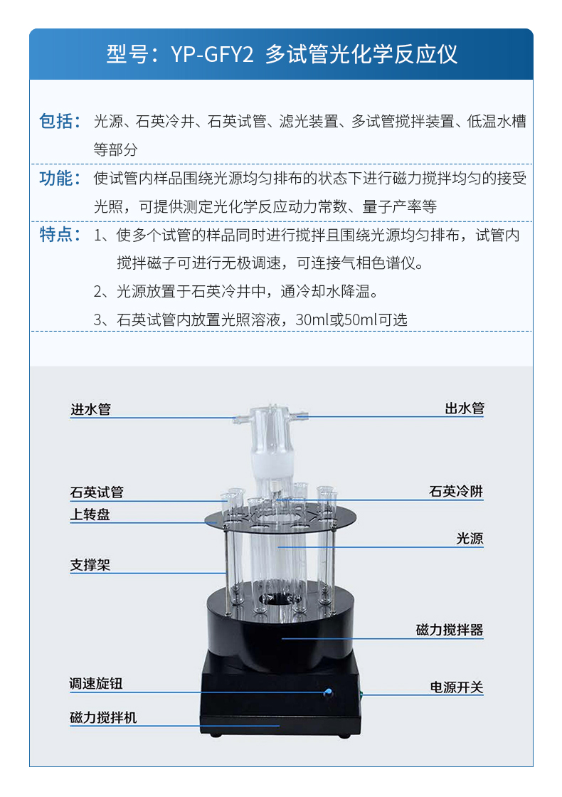 | 多試管+大容量反應(yīng)器 | 包括:光源、石英冷井、石英試管、濾光裝置、多試管攪拌裝置、大容量反應(yīng)器、低溫水槽等部分。 功能:使試管內(nèi)樣品圍繞光源均勻排布的狀態(tài)下進(jìn)行磁力攪拌均勻的接受光照,可提供測(cè)定光化學(xué)反應(yīng)動(dòng)力常數(shù)、量子產(chǎn)率等 特點(diǎn):1、使多個(gè)試管的樣品同時(shí)進(jìn)行攪拌且圍繞光源均勻排布,試管內(nèi)攪拌磁子可進(jìn)行無(wú)極調(diào)速,可連接氣相色譜儀。 2、光源放置于石英冷井中,通冷卻水降溫。 3、石英試管內(nèi)放置光照溶液,30ml或50ml可選 |