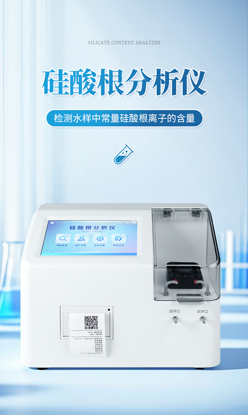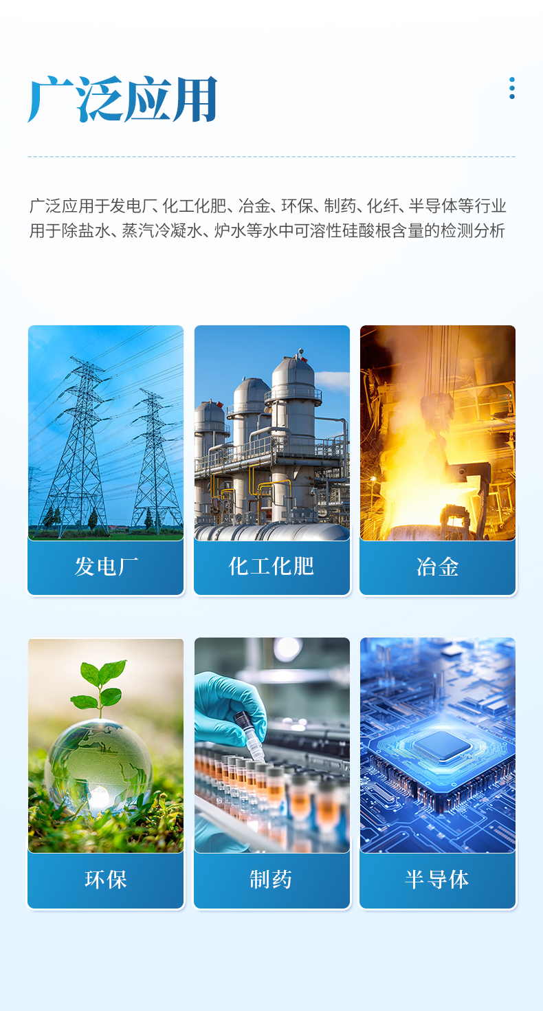 實驗室硅酸根分析儀適用于檢測樣水中常量硅酸根離子的含量。廣泛應用于發電廠、化工化肥、冶金、環保、制藥、化纖、半導體等行業,適用于除鹽水、蒸汽冷凝水、爐水等水中可溶性硅酸根含量的檢測分析;參考《GB/T12149-2017工業循環冷卻水和鍋爐用水中硅的測定》標準設計制造。