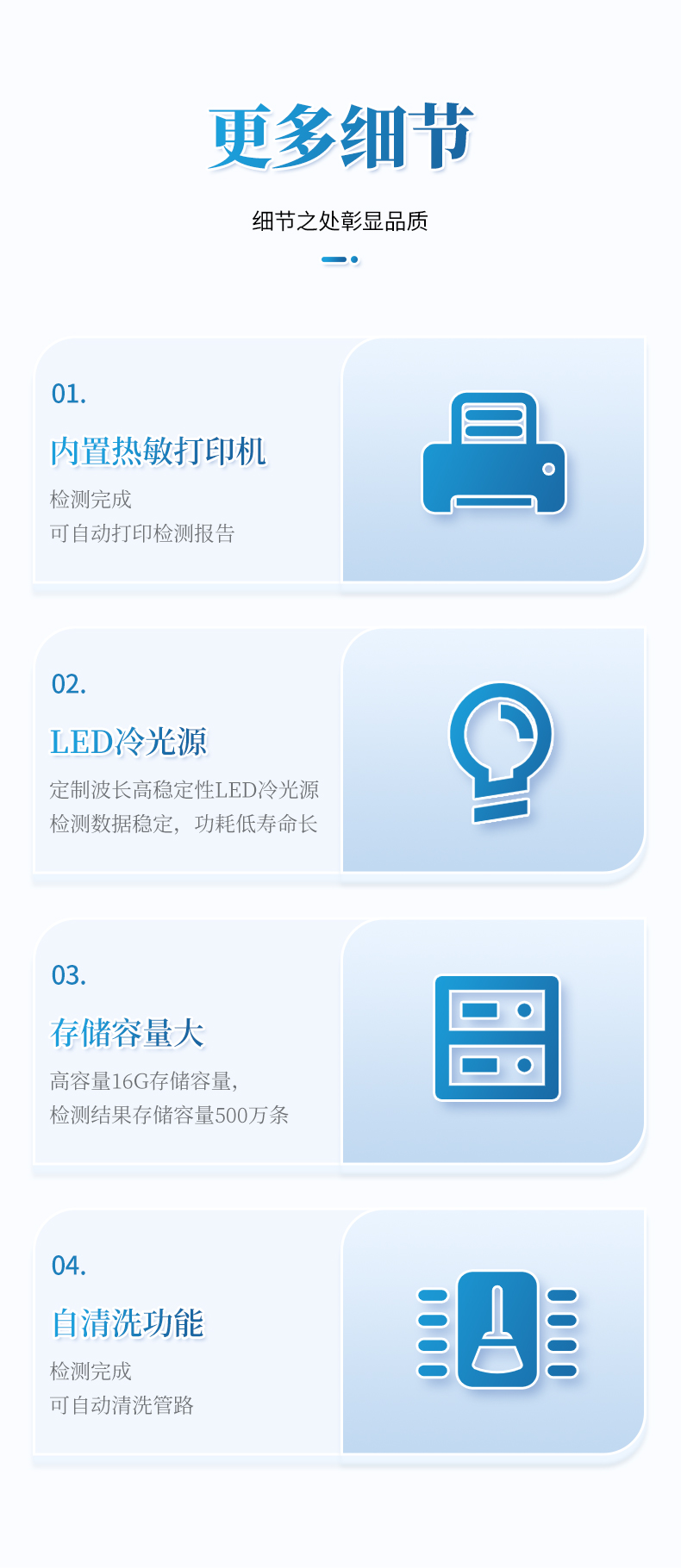 4、定制波長高穩定性LED冷光源,檢測數據更穩定,功耗低,壽命長;