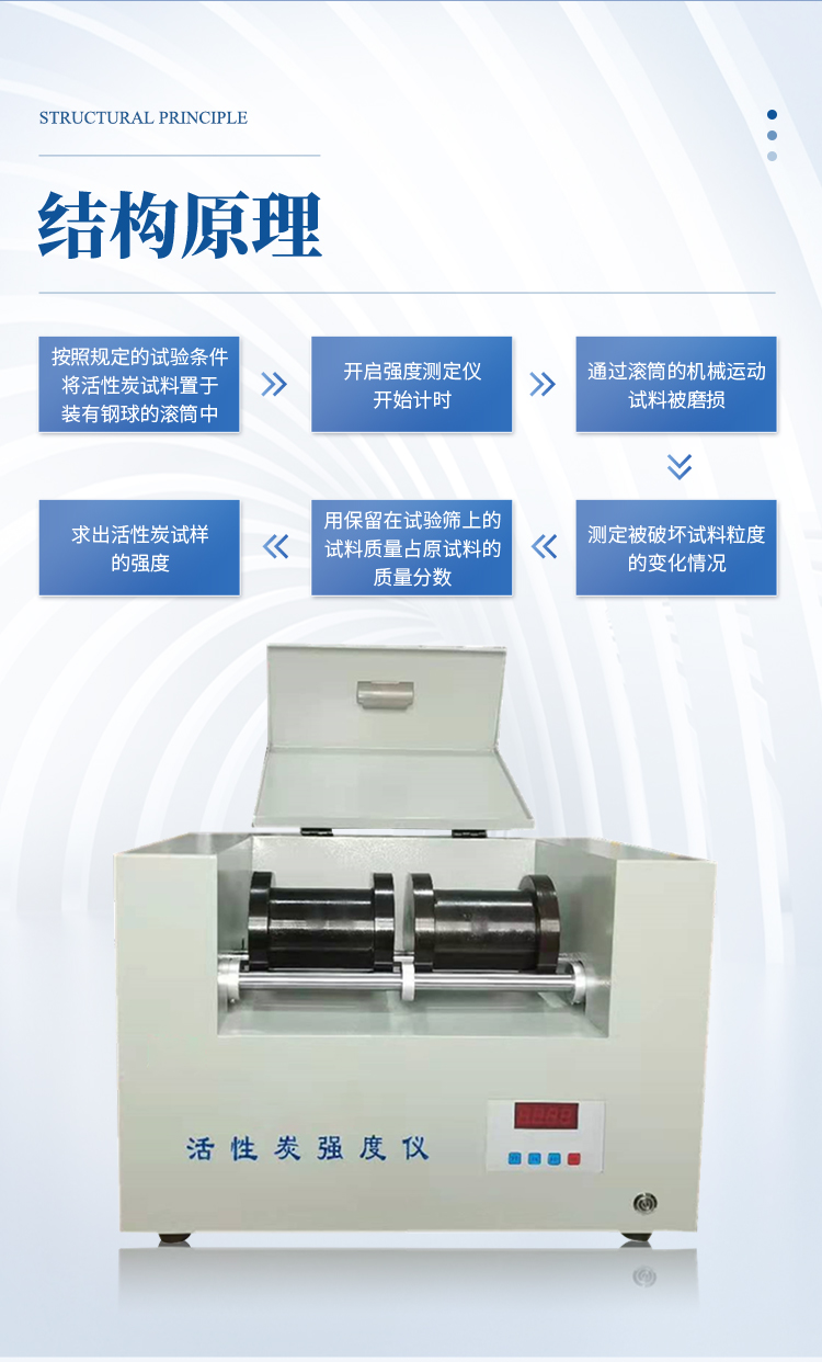 活性炭強度測定儀儀按照規定的試驗條件,將活性炭試料置于裝有鋼球的滾筒中,開啟強度測定儀,開始計時,通過滾筒的機械運動,試料被磨損,測定被**試料粒度的變化情況,用保留在試驗篩上的試料質量占原試料的質量分數,可求出活性炭試樣的強度。
