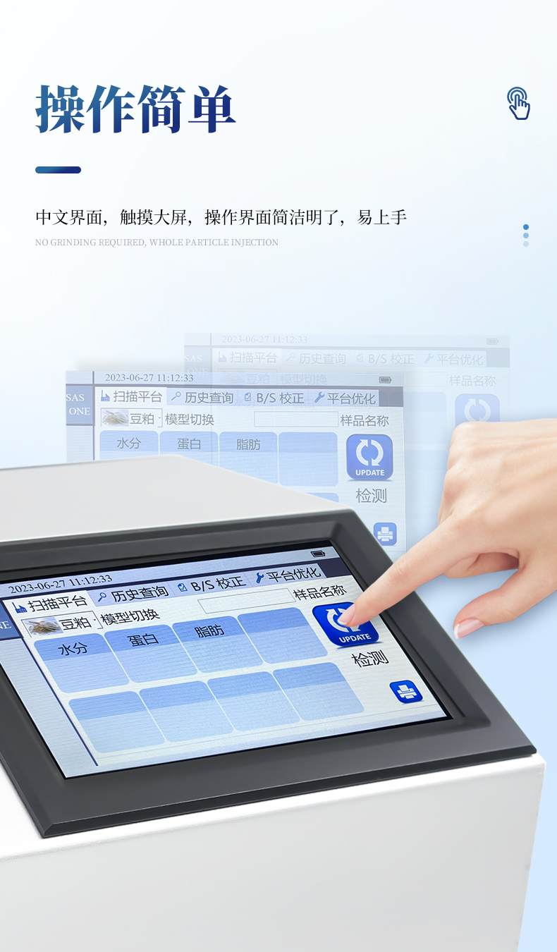 本儀器YP-GP200為近紅外光譜分析儀,可以根據近紅外光線照射樣品產生的光譜,快速分析不同物質中成分的種類(如蛋白、水分、油脂、纖維、灰分等)及含量,并可根據客戶需求添加模型。