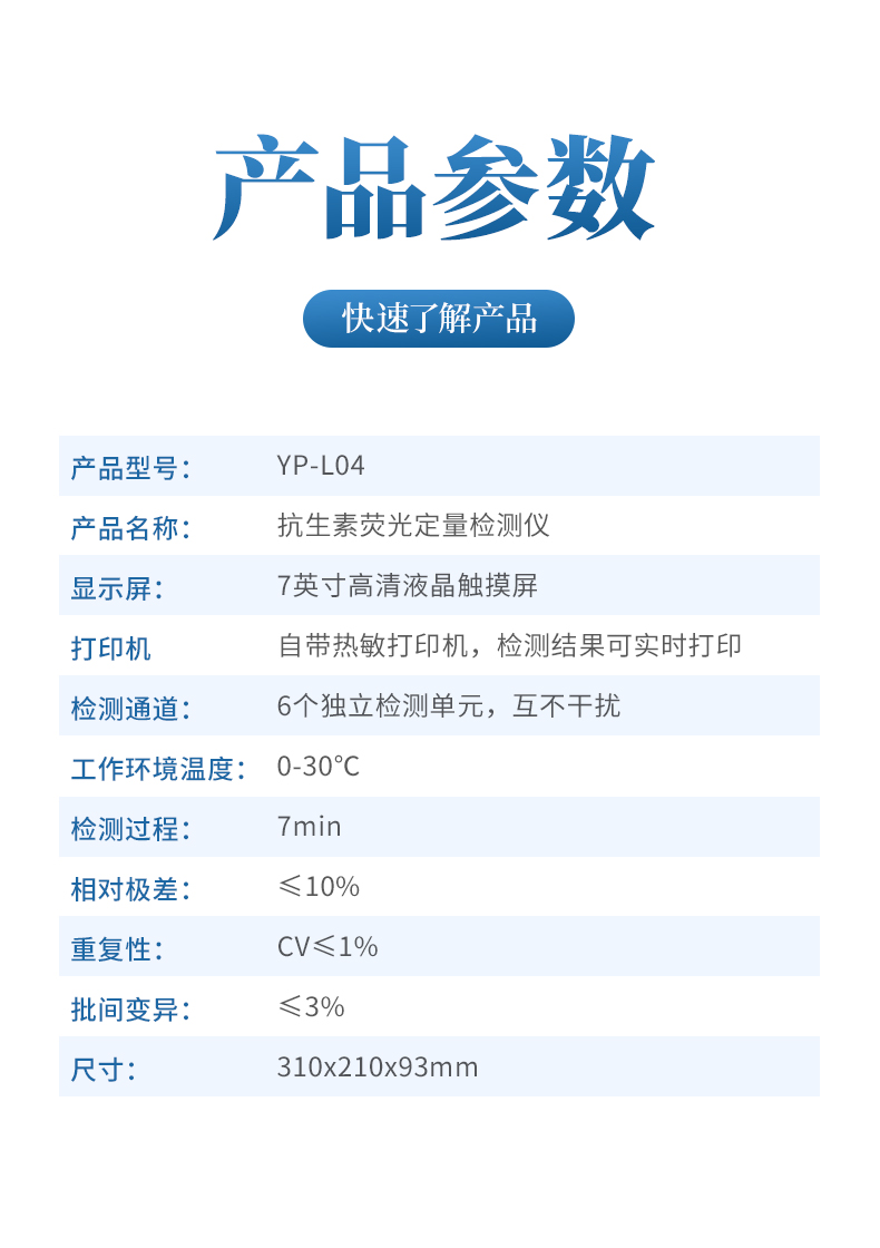 抗生素熒光定量檢測儀是一款熒光定量檢測食品抗生素的儀器設備,主要檢測呋喃唑酮、呋喃它酮、呋喃妥因、呋喃西林、磺胺類藥物、氟喹諾酮類、氯霉素、四環素、氟苯尼考、喹乙醇等畜禽、水產品藥物殘留的定量檢測;樣品前處理簡單,整個檢測過程7min,可以多樣品、多種類同時進行檢測,大大提高批量定量檢測的效率;產品適用于水產養殖流通企業、農業系統、市場監督管理系統、出入境檢驗檢疫、生鮮超市、農貿市場、農批市場、食堂、科研單位等行業。