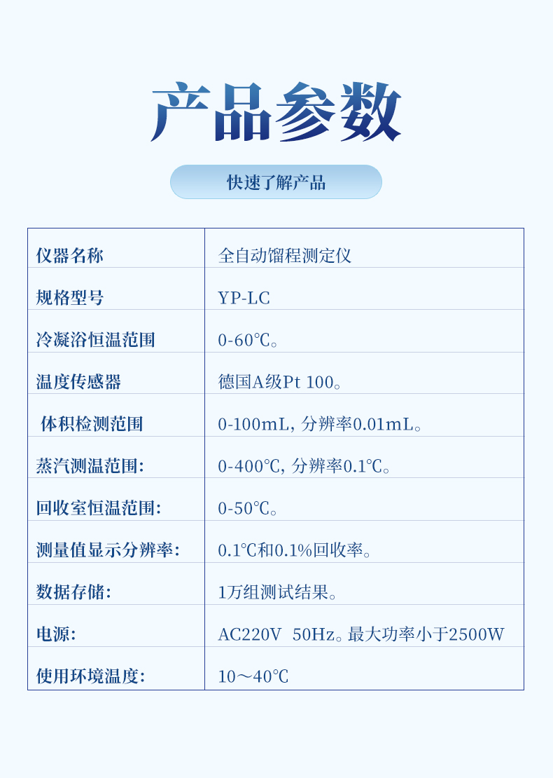 感謝您選用YP-LC全自動餾程測定儀,該儀器依據(jù)國標GB/T 18255-2000、GB/T 7534-2004 GB/T 3146.1-2010、GB/T 18589-2001試驗方法設計、制造的。適用于天然汽油(穩(wěn)定輕烴)、車用汽油、航空汽油、噴氣燃料、特殊沸點的溶劑、石腦油、煤油、煤焦油、柴油、粗柴油餾分燃料和相似的石油產品的餾程測定。