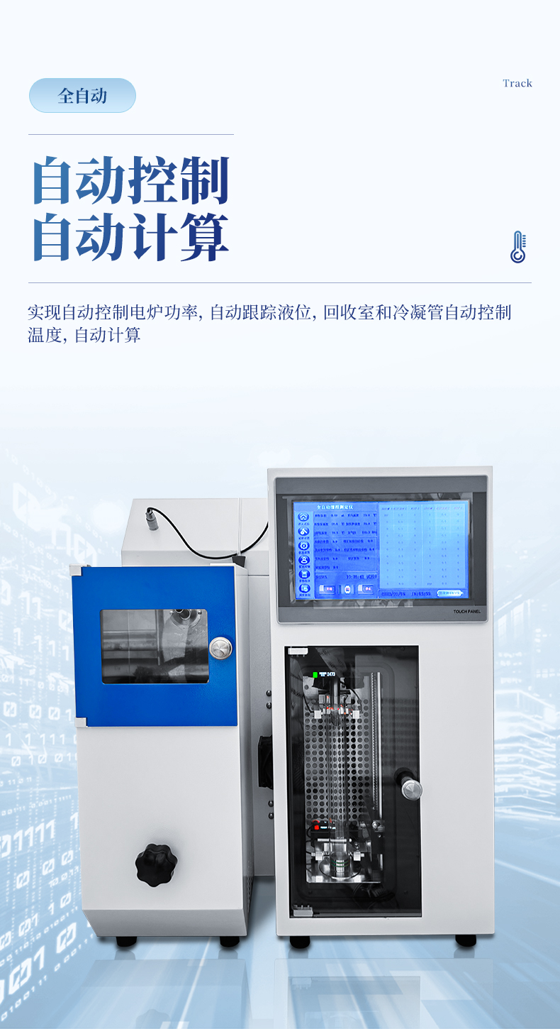 8.儀器實現(xiàn)自動控制電爐功率,自動跟蹤液位,回收室和冷凝管自動控制溫度,自動計算。