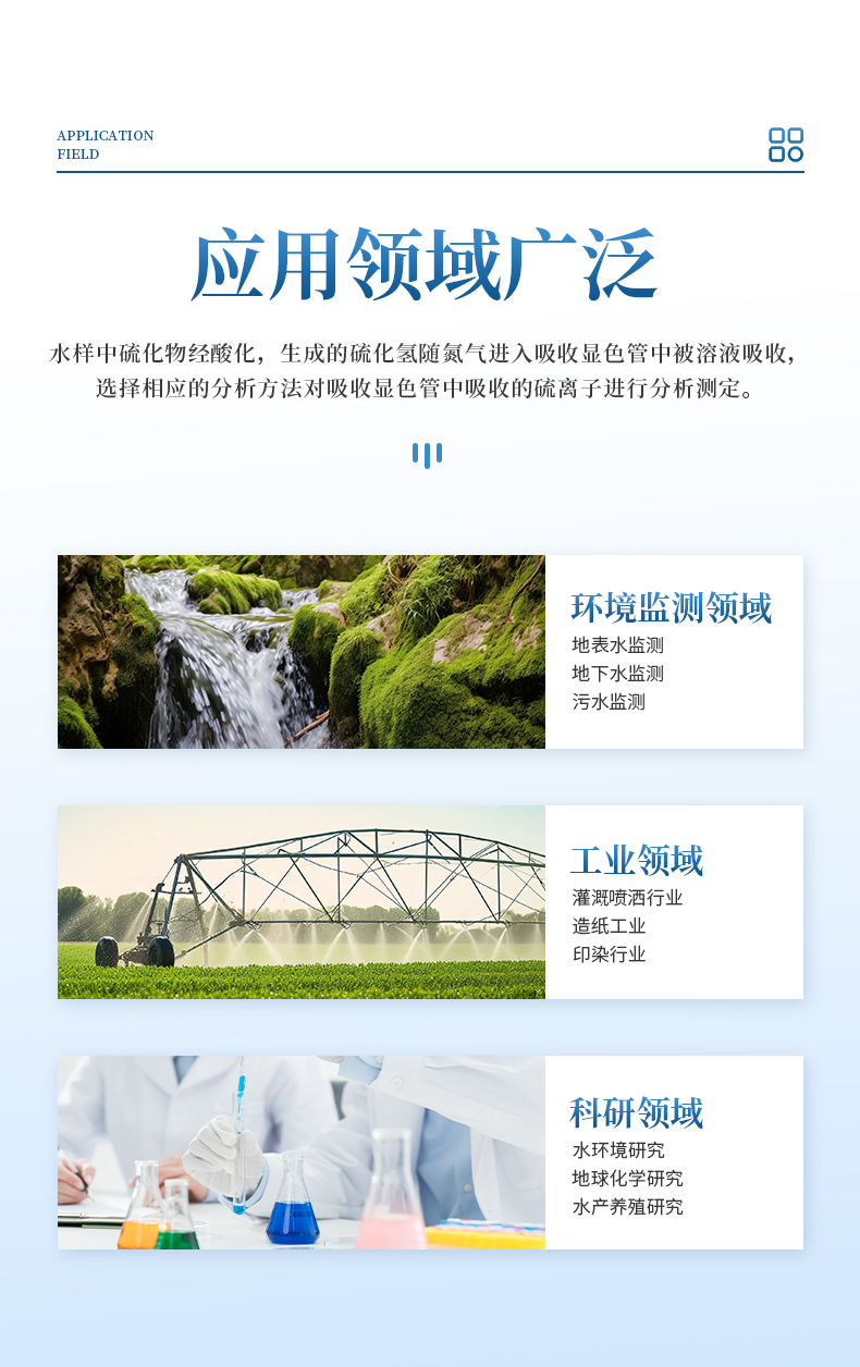水樣中的硫化物經酸化,生成的硫化氫隨載氣(氮氣)進入吸收瓶/吸收顯色管中被吸收溶液(乙酸鋅-乙酸鈉溶液或2%氫氧化鈉溶液)吸收,選擇相應的分析方法對吸收瓶/吸收顯色管中吸收的硫離子進行分析測定。