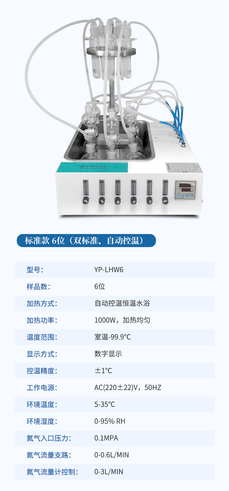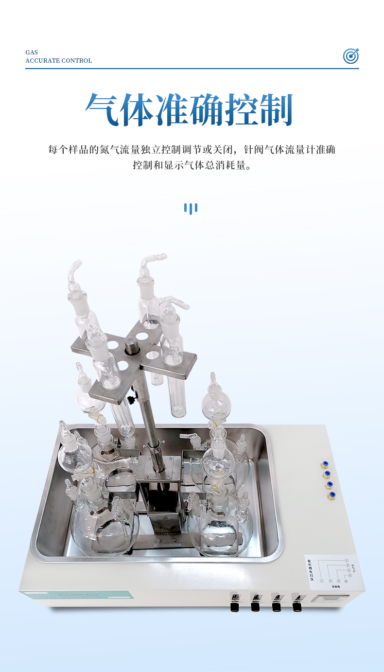 5、每個樣品的氮氣流量獨立控制調節或關閉,針閥氣體流量計準確控制和顯示氣體總消耗量。