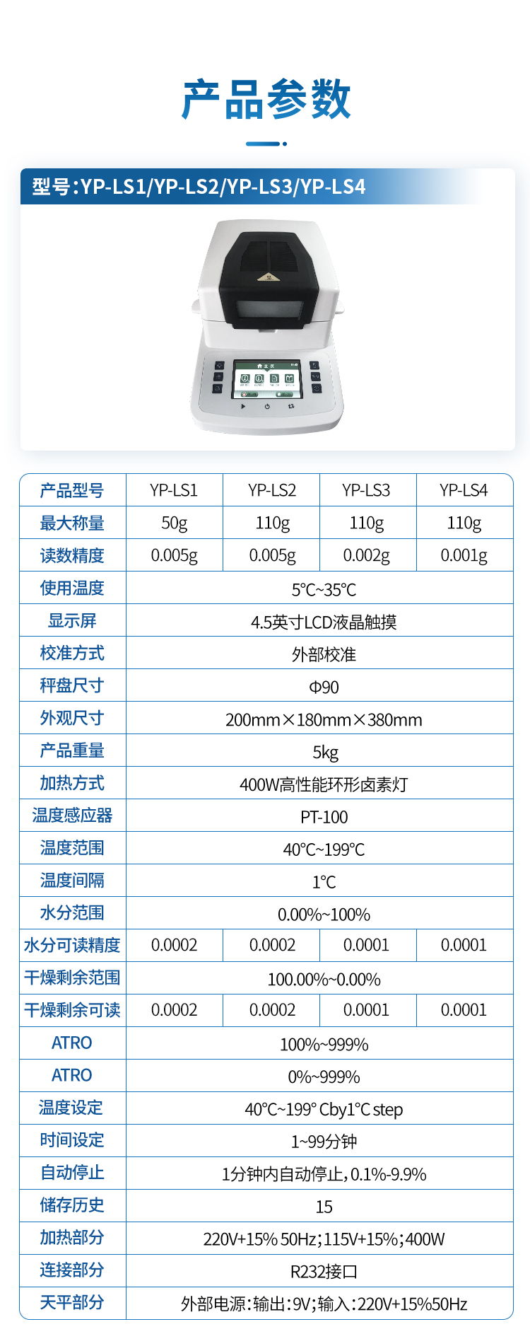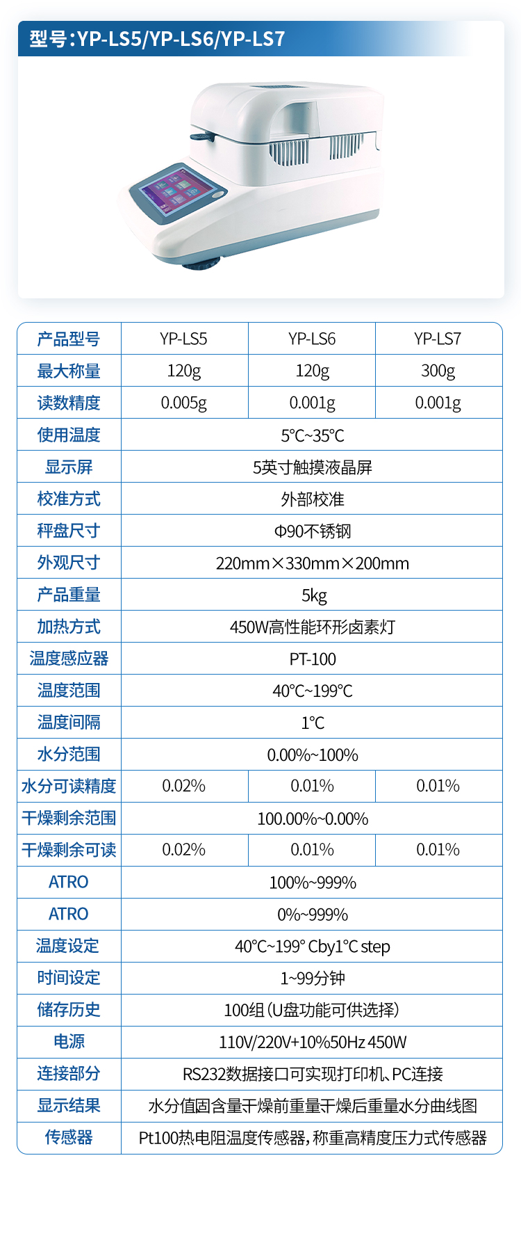 | 顯示結果 | 水分值、固含量、干燥前重量、干燥后重量、水分曲線圖 | |