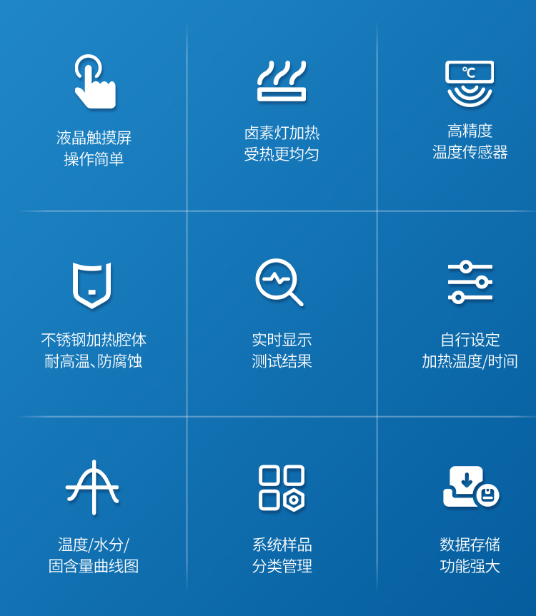 該系列快速水分測定儀應用了國際烘箱干燥法原理,測定結果與烘箱法水分測定具有良好的一致性,工作效率卻遠遠高于烘箱法水分測定,一般樣品只需要幾分鐘即可測量完畢,因此受到廣大用戶的青睞與好評。