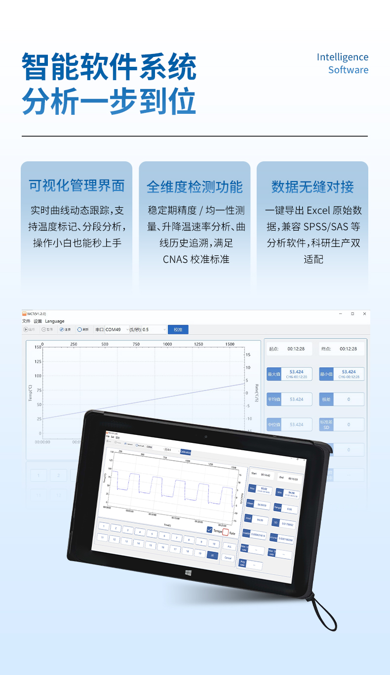 3.20通道/0.5S的高速溫度采集速度,適應大部分10℃/S以下的管內升降溫實時數據采集,不損失有效溫度數據