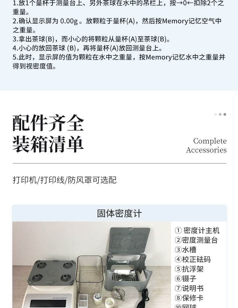密度計主機②密度測量臺③水槽④校正砝碼⑤抗浮架⑥鑷子⑦說明書⑧保修卡⑨網球⑩玻璃杯?電源