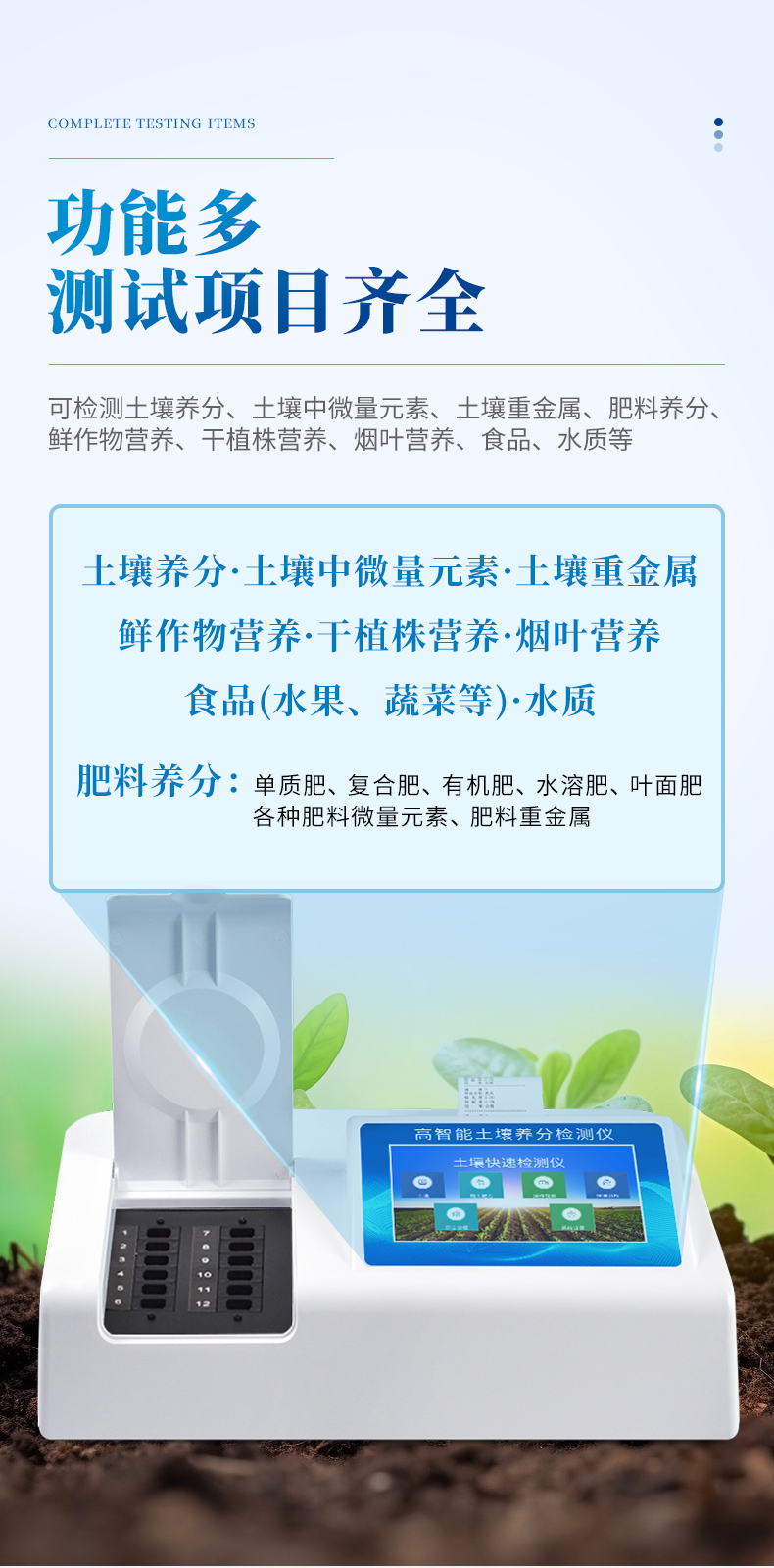 配套齊全:該儀器相當于一個小型實驗室,無需用戶自配附件。適于農業服務部門或農資經銷商、高教院校、科研院所、合作社、肥料廠商、大種植戶測土施肥和鑒別肥料真假及環保檢測應用。