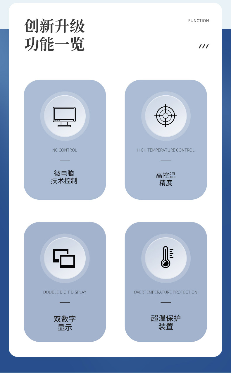 6.智能數字溫控器,可定時,雙數字顯示,調節采用PID技術并可實現超溫報警及防干燒。