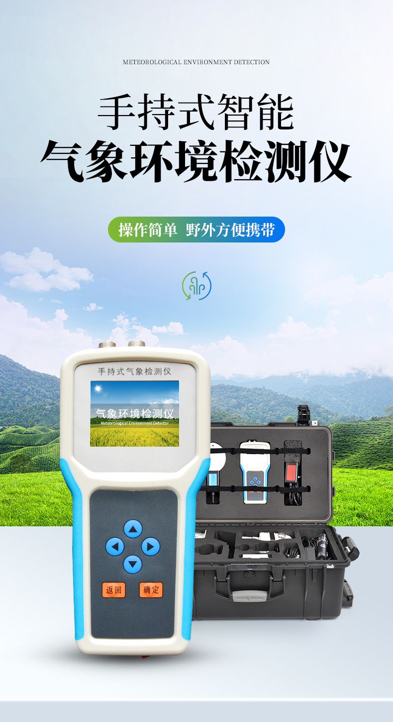 手持式智能農業氣象環境檢測儀是我們專門針對農田、草場局部小尺度環境設計的,對與植被和農作物生長密切相關的土壤、水氣等環境參數監測的農田小氣候站。它主要觀測與農業相關的空氣溫度、空氣濕度、光照強度、二氧化碳濃度、露點溫度、光合有效輻射、土壤溫度、土壤濕度、土壤鹽分、土壤PH等10個環境參數氣象要素,為農業科研、農業生產等提供良好的支持。