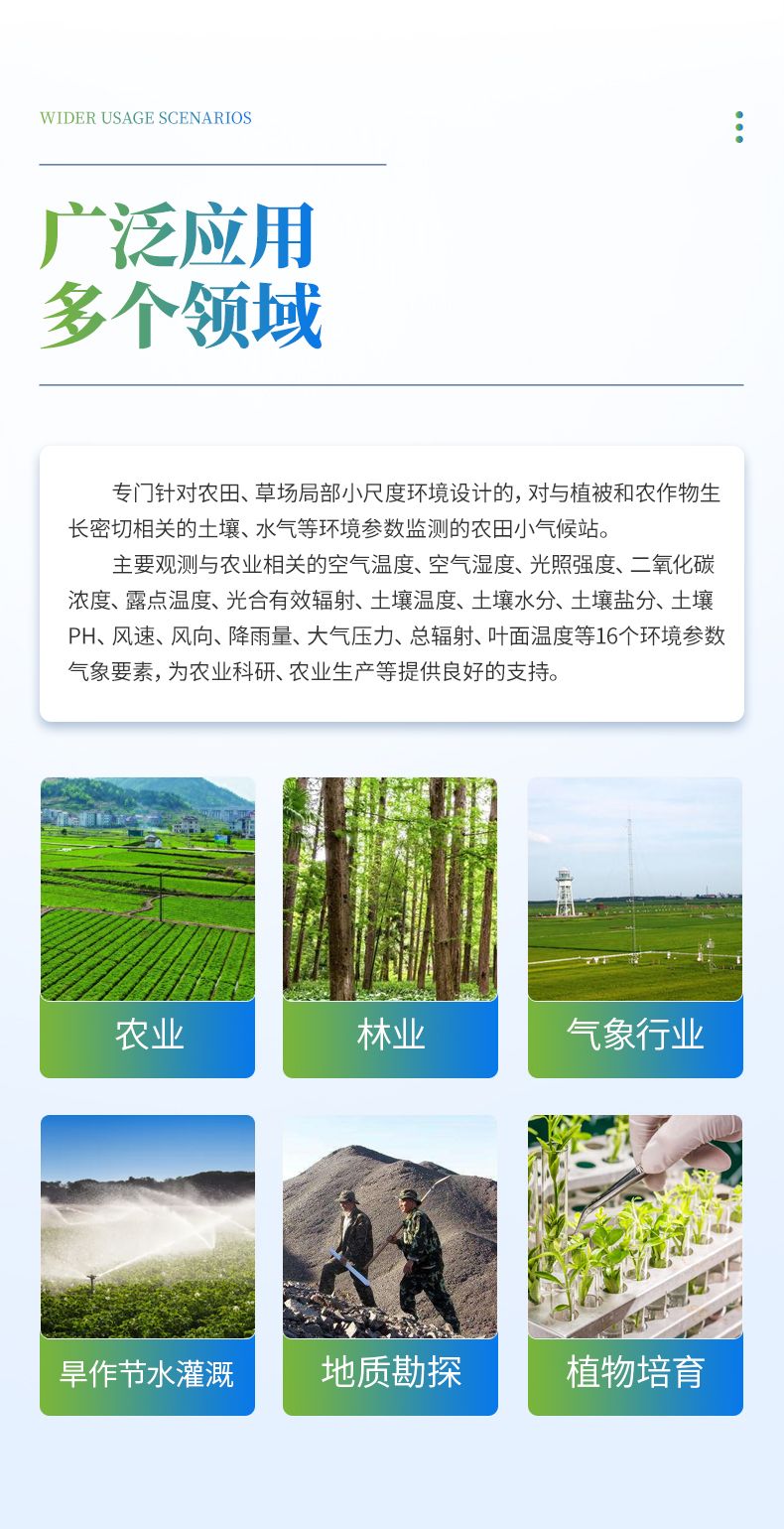廣泛應用于農業、林業、環保、水利、氣象行業、旱作節水灌溉、地質勘探、植物培育等領域。