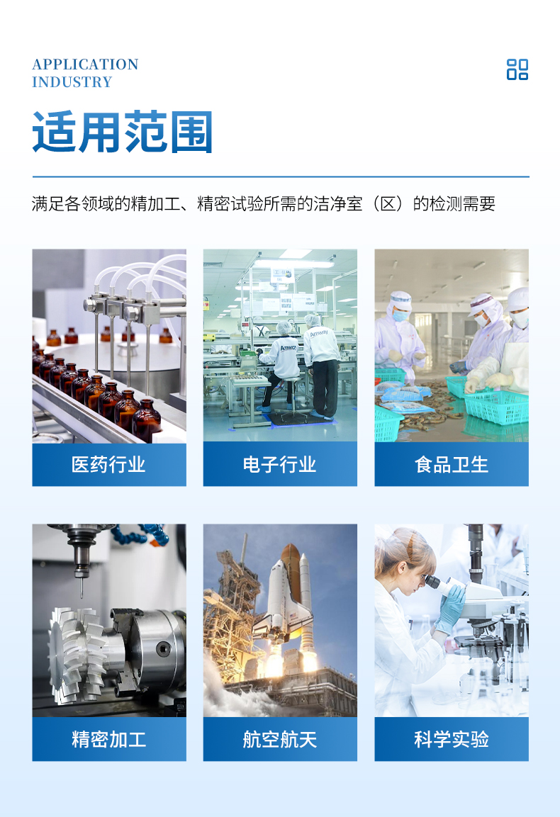 滿(mǎn)足醫(yī)藥行業(yè)(制藥廠(chǎng)、藥檢所、醫(yī)院等);電子行業(yè)(半導(dǎo)體工廠(chǎng)、精密機(jī)械的生產(chǎn)加工等);食品衛(wèi)生行業(yè)(乳制品、塑封肉食品、調(diào)味食品、農(nóng)產(chǎn)品等的精加工);過(guò)濾器的生產(chǎn)廠(chǎng)家(檢驗(yàn)過(guò)濾器的質(zhì)量及效率等);光學(xué)及航空航天等領(lǐng)域的精加工、精密試驗(yàn)、生物工程等所需的潔凈室(區(qū))的檢測(cè)需要。