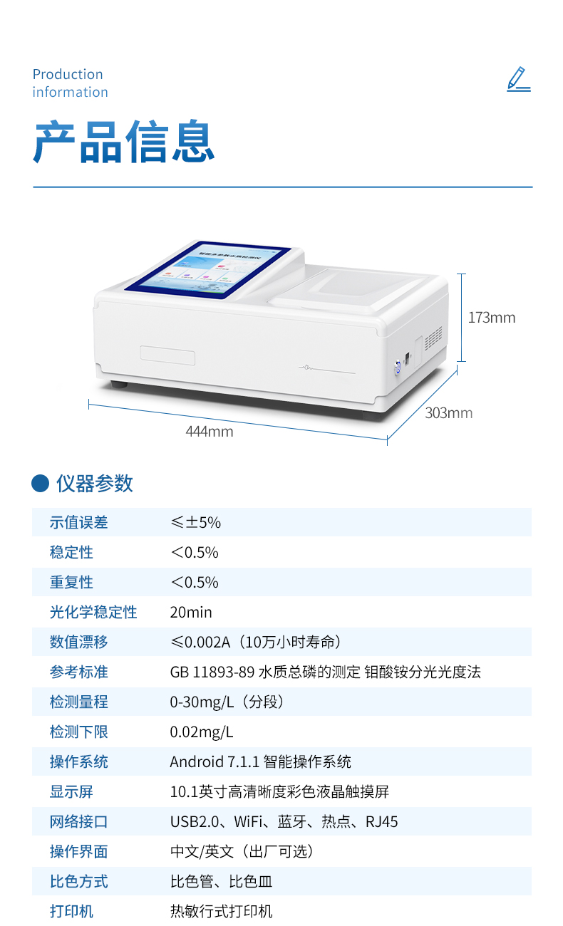 智能總磷測定儀是參考《GB 11893-89 水質(zhì)總磷的測定 鉬酸銨分光光度法》標準設計制造,主要檢測水質(zhì)總磷濃度指標;本儀器兼具智能數(shù)據(jù)分析功能,圖表、列表顯示數(shù)據(jù),分析一目了然;高清晰度彩色液晶觸摸顯示屏,Android智能操作系統(tǒng),中文顯示界面,中英文鍵盤,人性化操作,使用更簡單。