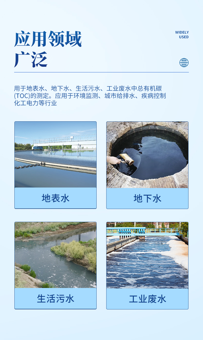 地表水、地下水、生活污水、工業(yè)廢水中總有機(jī)碳(TOC)的測(cè)定,應(yīng)用于環(huán)境監(jiān)測(cè)、城市給排水、疾病控制、化工電力等行業(yè)。