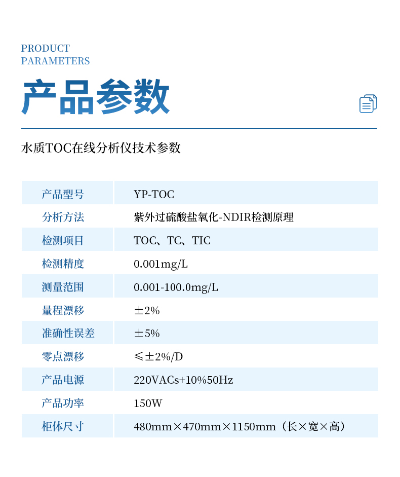 用于測定水中總有機(jī)碳濃 度,可以檢測TOC濃度從0.001mg/L-100.0mg/L的水樣,具有高靈敏度和精確度,以及良好的穩(wěn)定性。符合EPUSP及2015版《中國藥典》要求