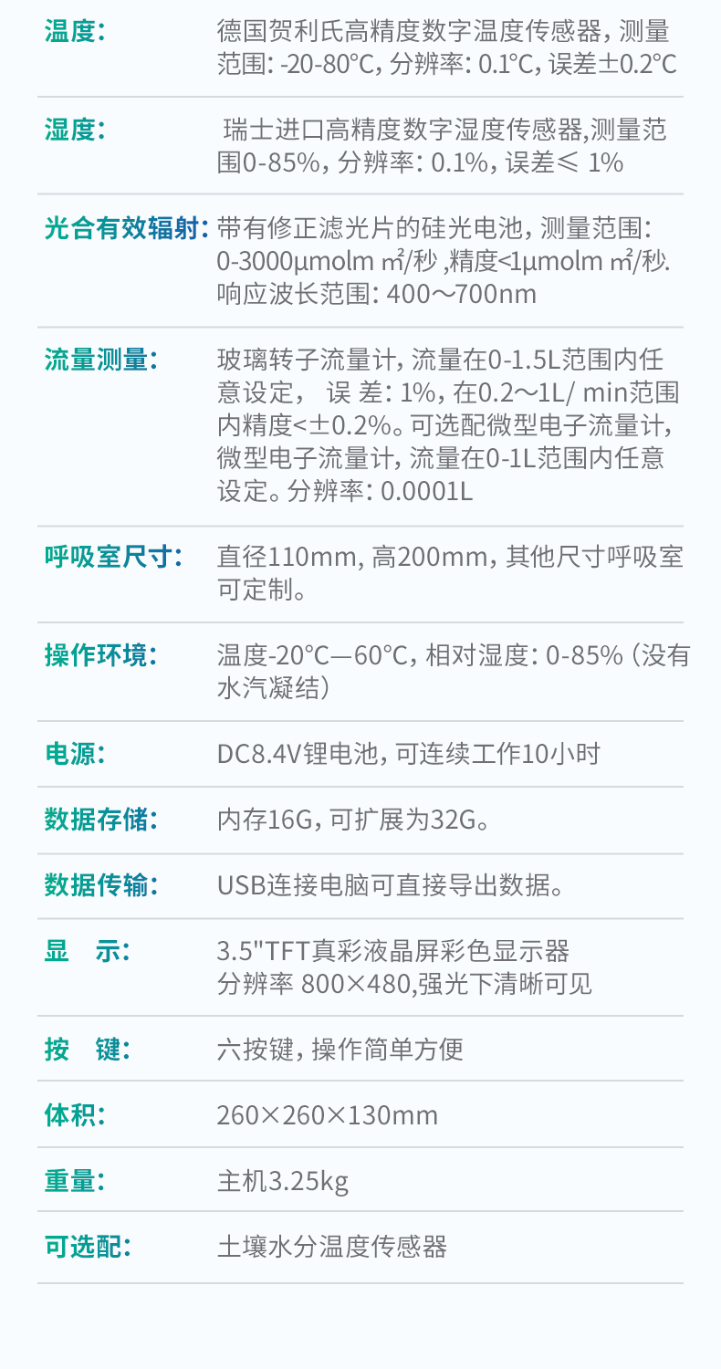 加入了溫度調節的雙波長紅外二氧化碳分析器, 測量范圍:0-5000ppm,分辨率:0.1ppm; 精度3ppm。二氧化碳測量不受溫度變化影響,具有穩定、精度高,反映靈敏,1秒鐘之內就可以完成二氧化碳差值采集。
