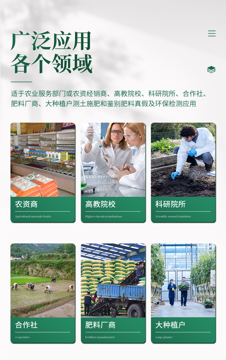 土壤養分:● 銨態氮、速效磷、速效鉀、水份、有機質、酸堿度(pH試紙法)等項;