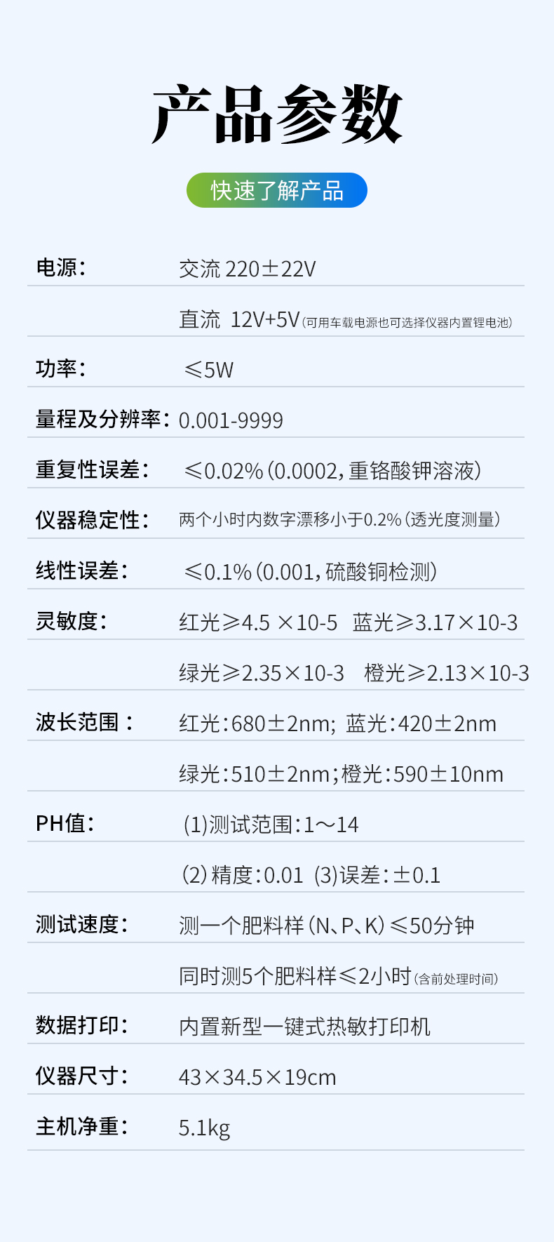 11.測(cè)試速度:測(cè)一個(gè)肥料樣(N、P、K)≤50分鐘(含前處理時(shí)間,不需用戶提供任何附件)