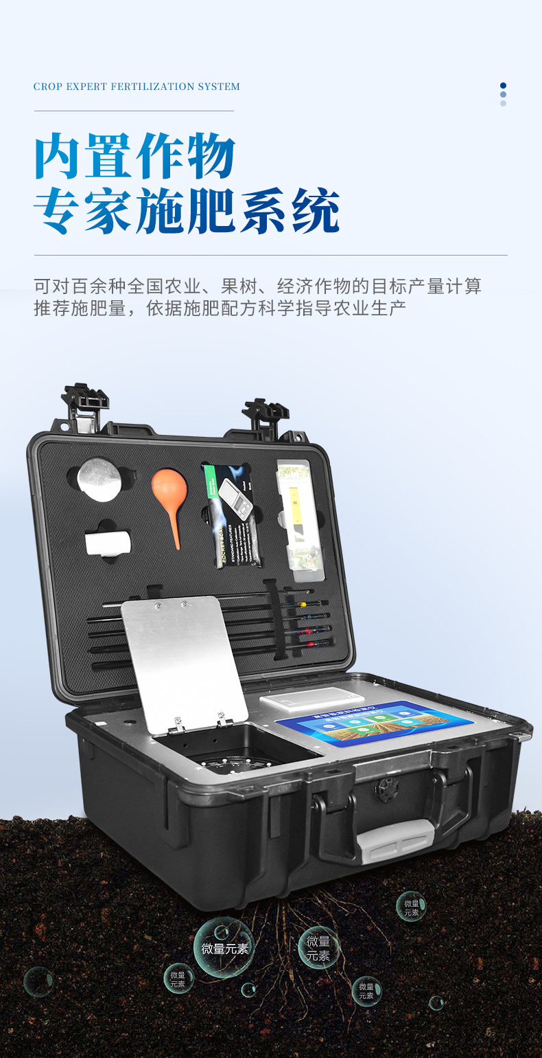 配套齊全,該儀器集藥、器、儀為一體,攜帶方便,相當(dāng)于一個(gè)小型實(shí)驗(yàn)室,用戶只需提供蒸餾水即可在要求時(shí)間內(nèi)完成全部操作。適于農(nóng)業(yè)服務(wù)部門或農(nóng)資經(jīng)銷商鑒別肥料真假、肥料廠商肥料生產(chǎn)中控、農(nóng)資質(zhì)檢部門進(jìn)行農(nóng)資打假,規(guī)范農(nóng)資市場(chǎng)。
