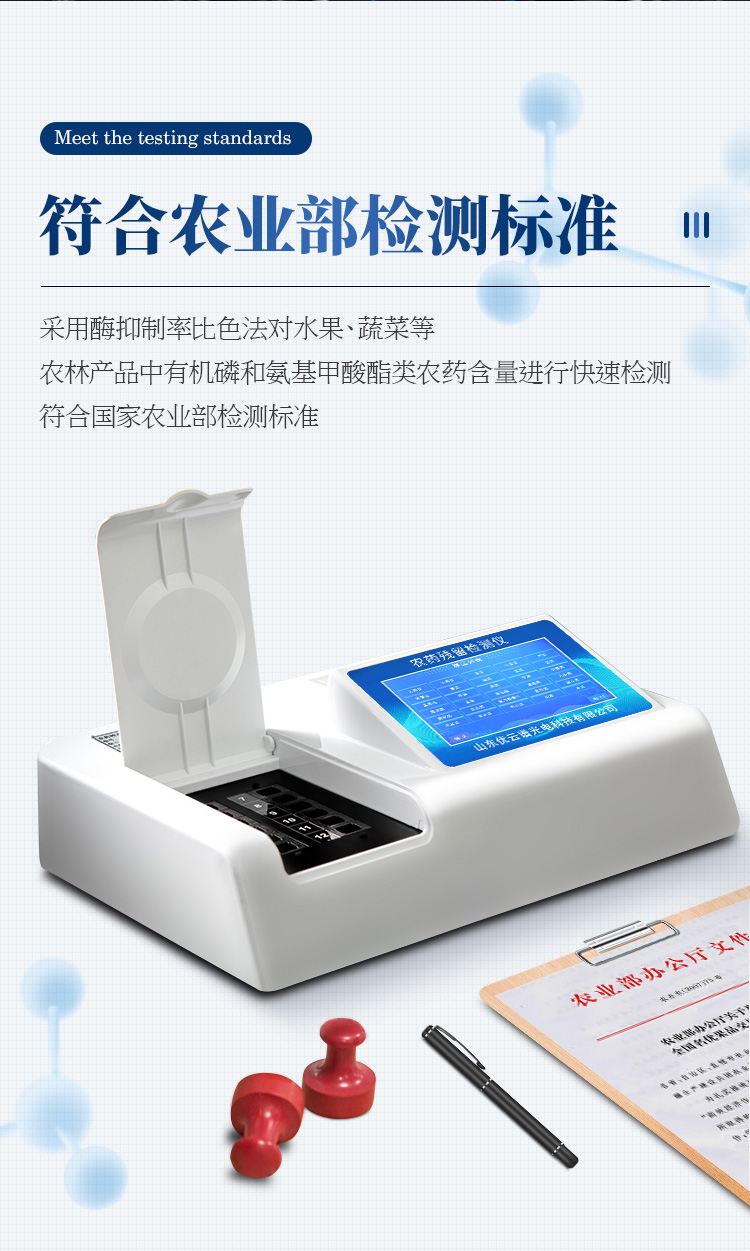 廣泛應用于主要用于蔬菜、水果、茶葉、糧食、農副產品等食品中有機磷和氨基甲酸酯類農藥殘留的快速檢測;此外還可用于果蔬茶生產基地和農貿批發銷售市場現場檢測,餐館、學校、食堂、家庭果蔬加工前的安全速測等。