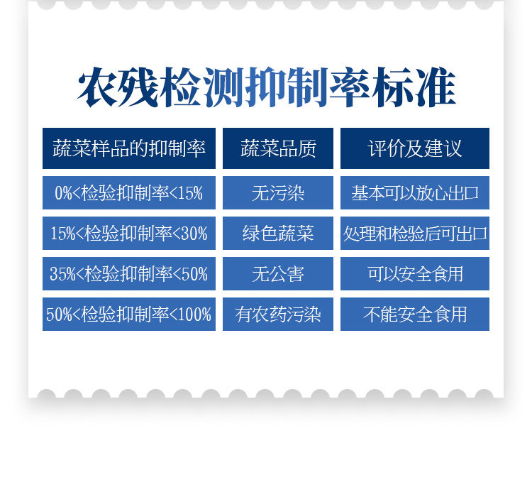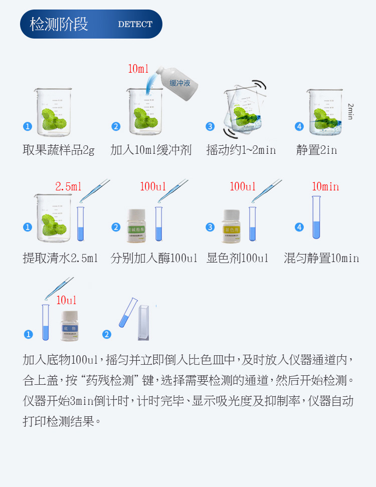 檢測標準:依據國家標準方法(GB/T5009.199-2003)以及世界衛生組織WHO、世界糧農組織FAO殘留農藥檢測標準、世界環境保護局EPA參照攝入量等要求來設計。采用酶抑制率比色法對水果、蔬菜等農林產品中有機磷和氨基甲酸酯類農藥含量進行快速準確的檢測。