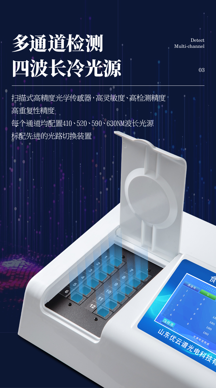 3、四波長冷光源,每個通道均配置410、520、590、630nm波長光源,標配先進的光路切換裝置,專利光路切換功能可實現(xiàn)最多64波長,并且所有檢測項目可實現(xiàn)所有通道同時檢測。