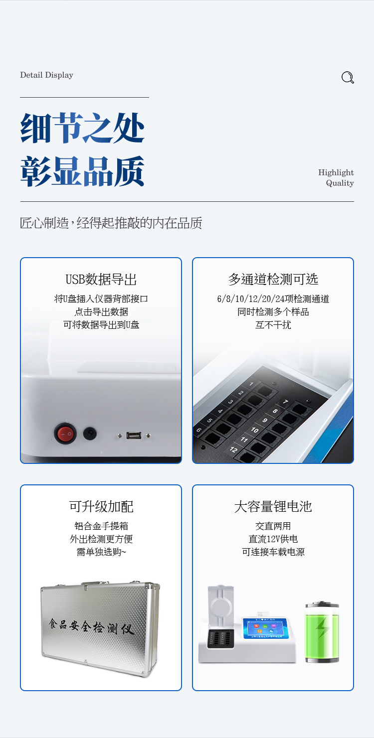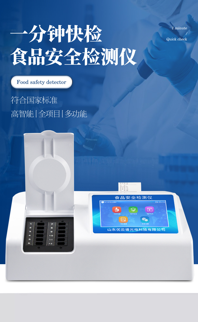 可快速檢測各類食品中的亞硝酸鹽、二氧化硫、甲醛、吊白塊、雙氧水、硼砂、農(nóng)藥殘留、乳及乳制品中蛋白質(zhì)、硝酸鹽、重金屬鉛的含量,儀器預留其他項目檢測程序和端口,根據(jù)日后需求可方便的自主增加檢測項目。
