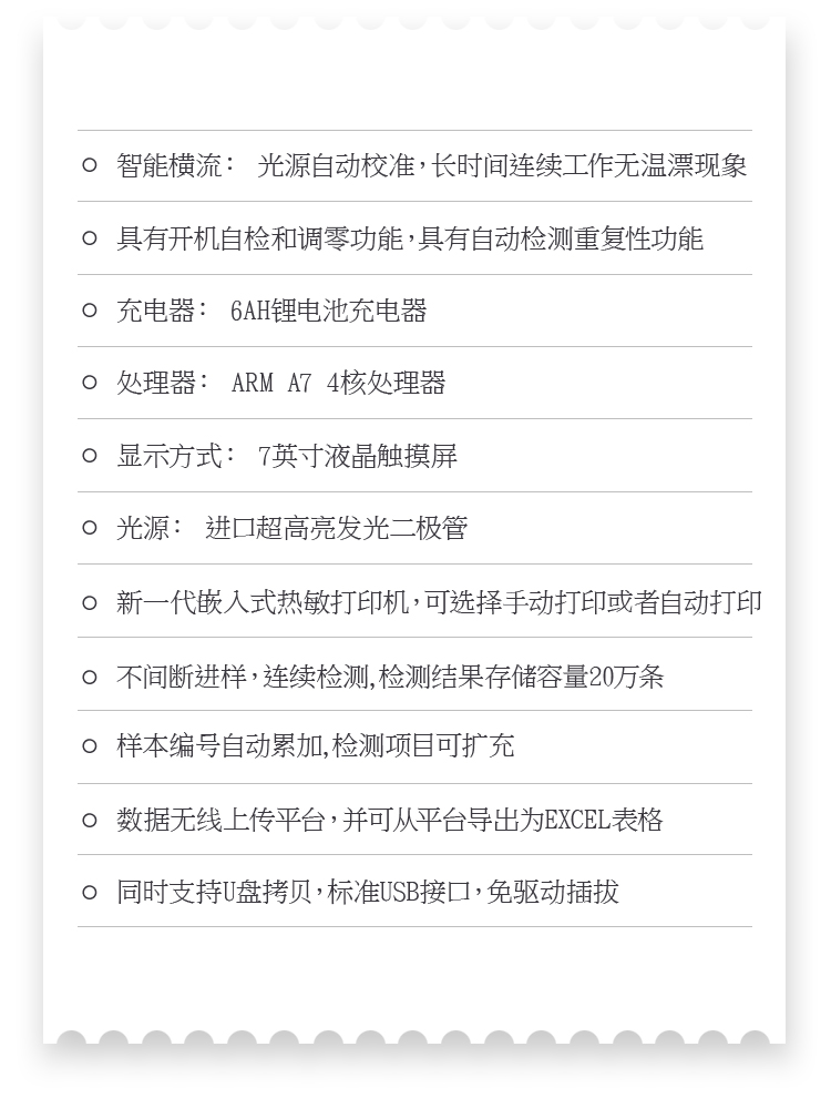 9、一體化便攜式快檢設(shè)備,滿(mǎn)足現(xiàn)場(chǎng)及流動(dòng)檢測(cè)使用需求,能夠在同一軟件下實(shí)現(xiàn)所有檢測(cè)項(xiàng)目的檢測(cè),并可通過(guò)同一窗口直觀顯示檢測(cè)結(jié)果。