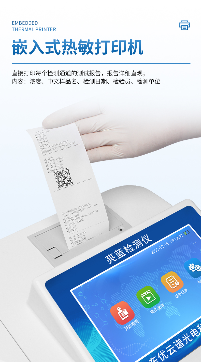 ●帶有嵌入式微型熱敏打印機,直接打印每個檢測通道的測試報告,報告詳細直觀,內(nèi)容:濃度、中文樣品名、檢測日期、檢驗員、檢測單位