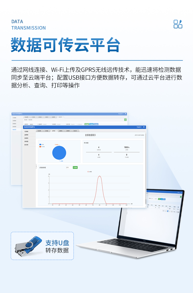 ●配置USB接口,支持U盤轉(zhuǎn)存,方便數(shù)據(jù)轉(zhuǎn)存至云平臺,通過平臺實現(xiàn)數(shù)據(jù)查詢、瀏覽、分析、統(tǒng)計、打印等。