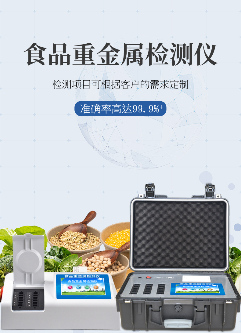 YP-BZ08重金屬檢測(cè)儀可廣泛應(yīng)用于大米、糧谷、果品、蔬菜、藥材、水質(zhì)、水產(chǎn)品中重金屬鉛、鎘、六價(jià)鉻、汞、砷、鐵、鎳、鋁的快速檢測(cè),檢測(cè)項(xiàng)目可根據(jù)客戶的需求定制。