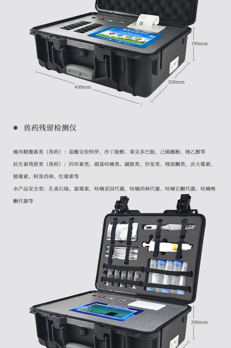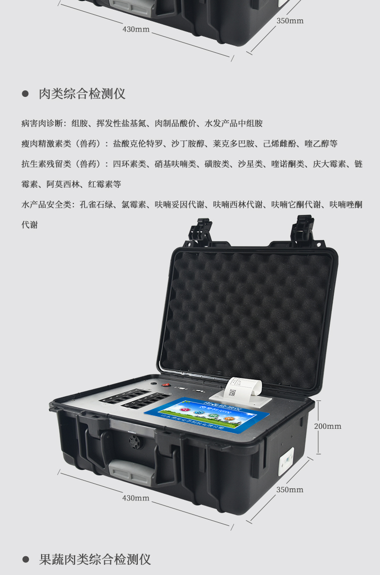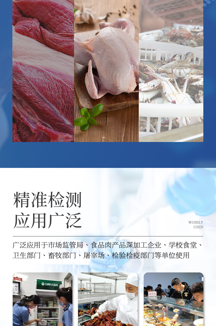 該多功能食品安全檢測儀為集成化食品安全快速檢測分析設備,廣泛應用于市場監管局、食品肉產品深加工企業、學校食堂、衛生部門、畜牧部門、屠宰場、檢驗檢疫部門等單位使用。
