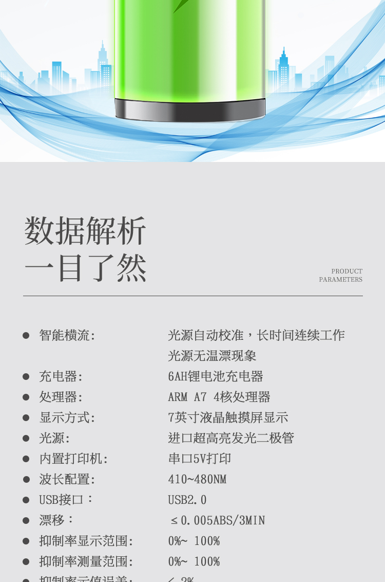 5、智能恒流穩壓,光強自動校準,長時間連續工作光源無溫漂現象。