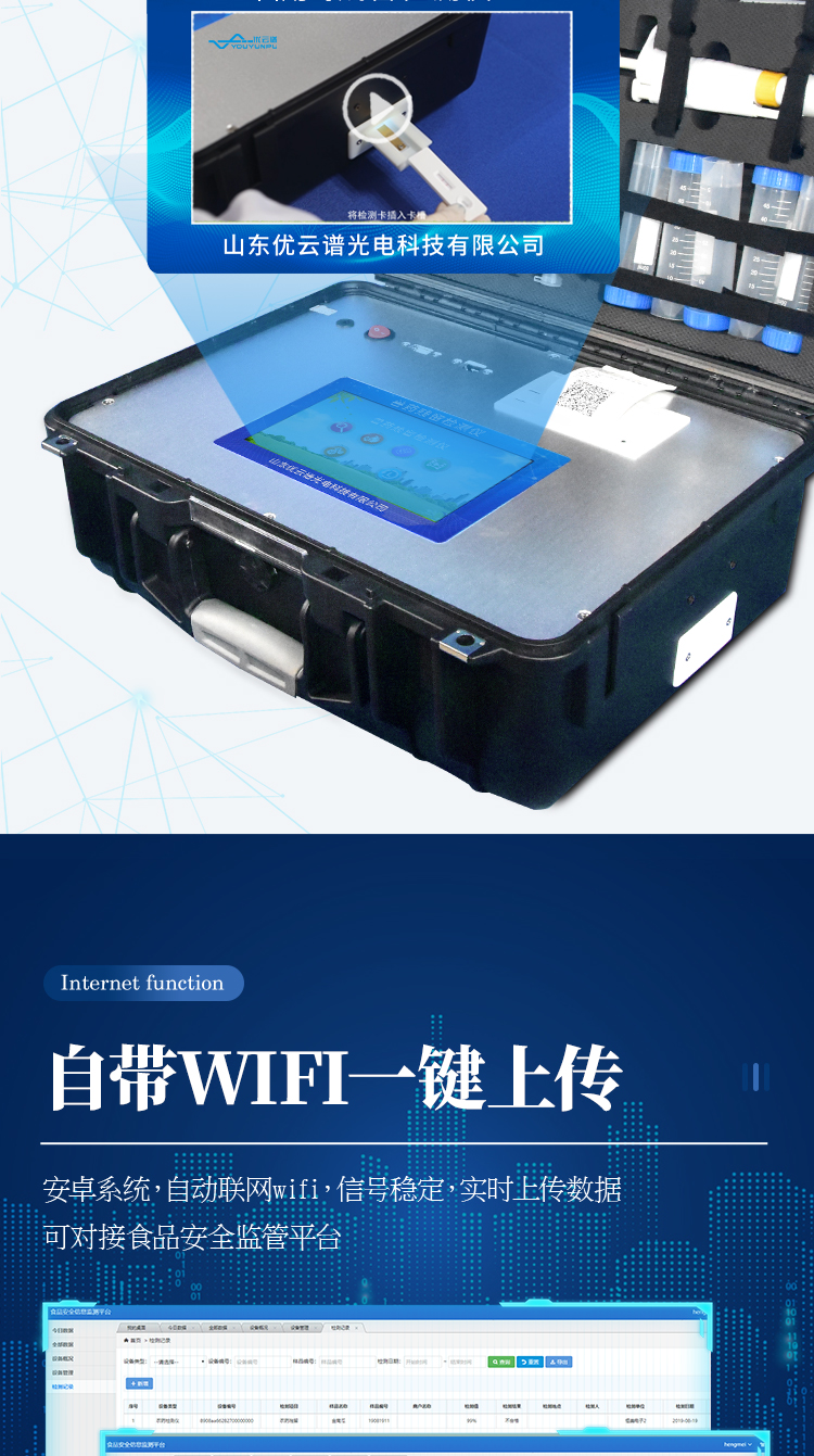 5、儀器帶有監管平臺,數據可局域網和互聯網數據上傳,檢測結果直接傳至食品安全監管平臺。進行區域食品安全監管及大數據分析處理與數據統計,檢測區域食品安全長短期動態,達到食品安全問題預估、預警