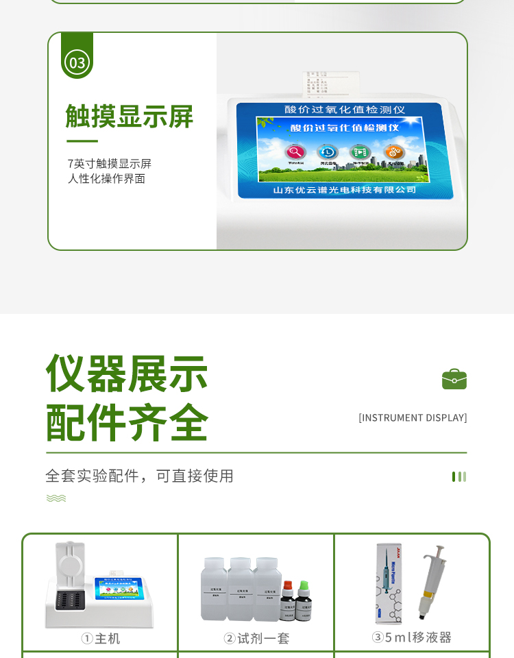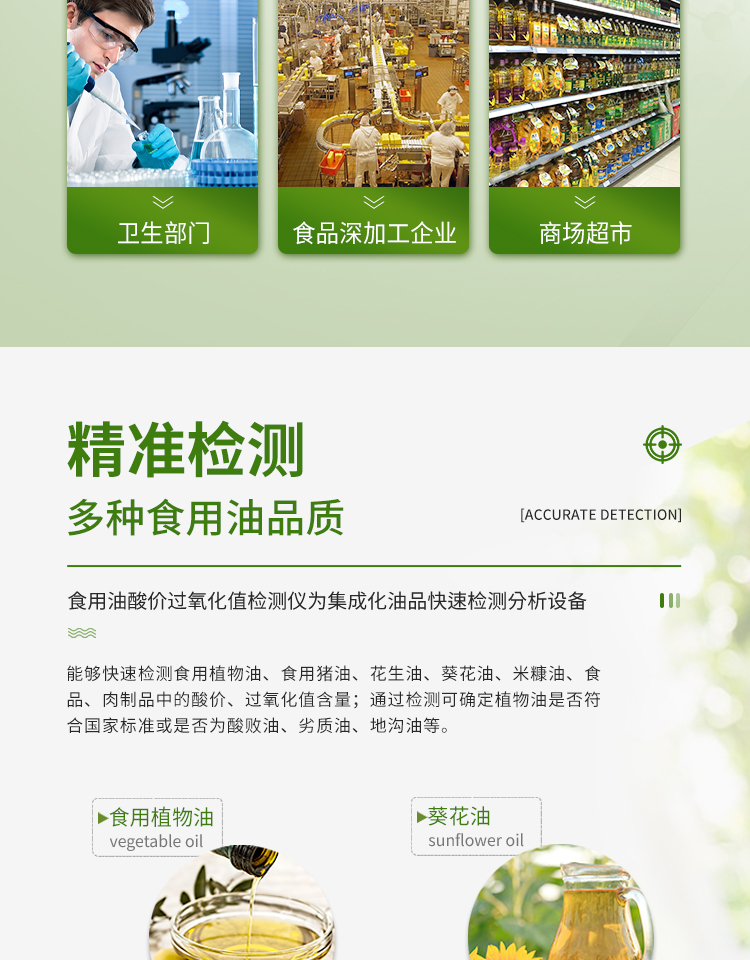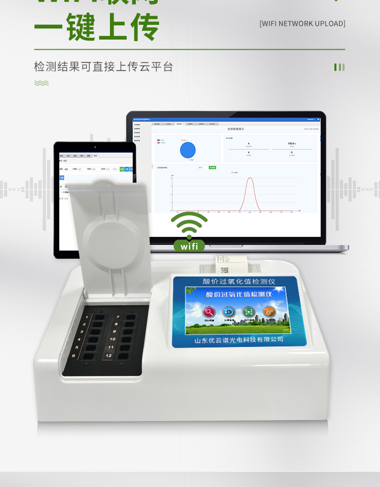 食用油酸價(jià)過氧化值檢測(cè)儀為集成化油品快速檢測(cè)分析設(shè)備,能夠快速檢測(cè)食用植物油、食用豬油、花生油、葵花油、米糠油、食品、肉制品中的酸價(jià)、過氧化值含量;通過檢測(cè)可確定植物油是否符合國家標(biāo)準(zhǔn)或是否為酸敗油、劣質(zhì)油、地溝油等。儀器預(yù)留其他項(xiàng)目檢測(cè)程序和端口,根據(jù)日后需求可方便的自主增加檢測(cè)項(xiàng)目。日后可升級(jí)為檢測(cè)水產(chǎn)品、面制品的綜合類型儀器。